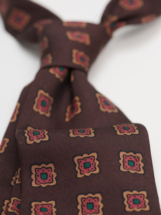 Oval Medallion Print Silk Self Tipped Tie, Brown