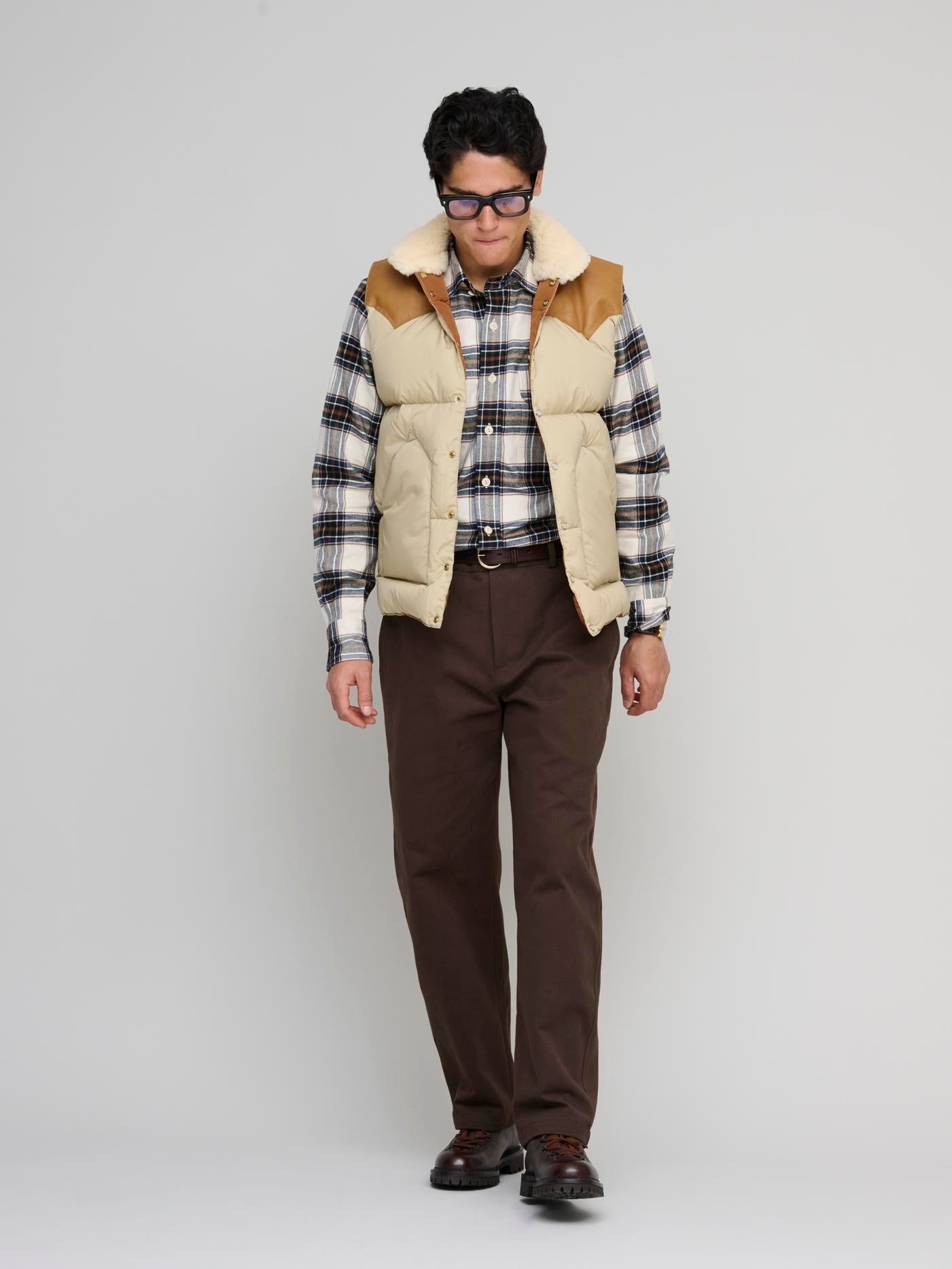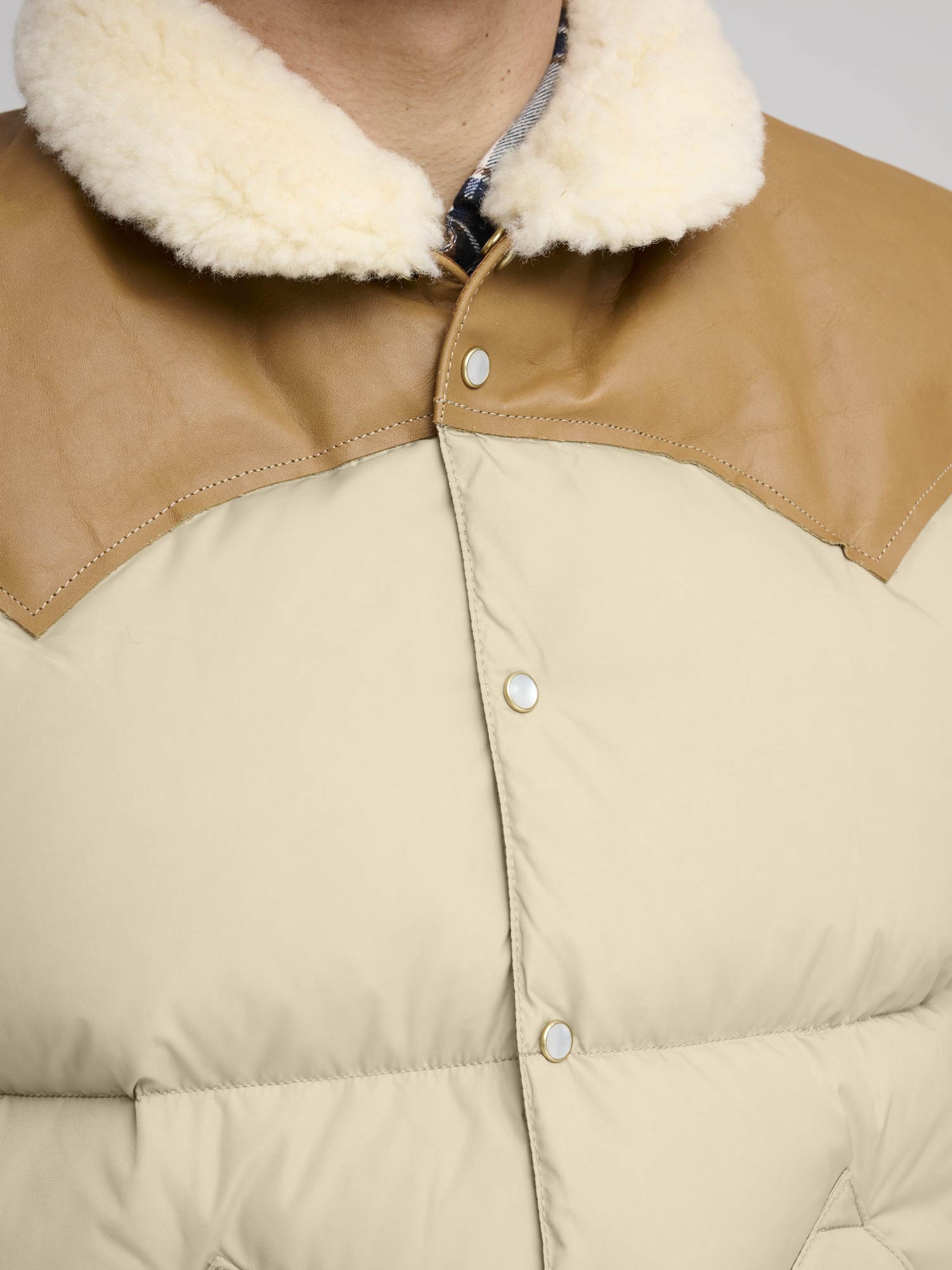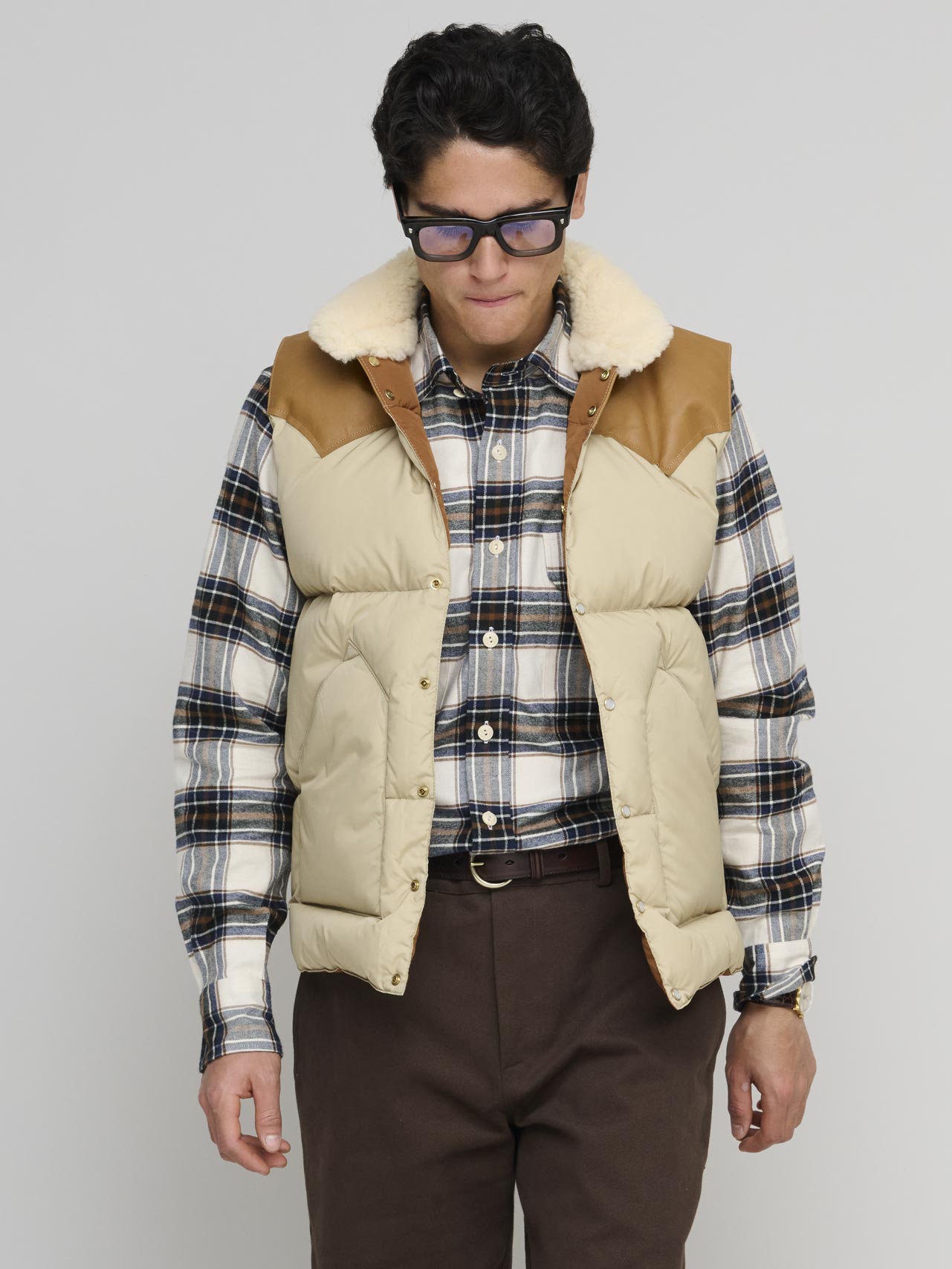 Crafted from soft hand leather and a water-repellent nylon, the Christy Vest is built to last. Features include a single-piece collar and shoulder piece, double layered pockets with velcro closures, and an interior pocket for cards. Additionally, the classic vintage design includes an authentic mouton and European down inside, and snaps shut with mother of pearl buttons.