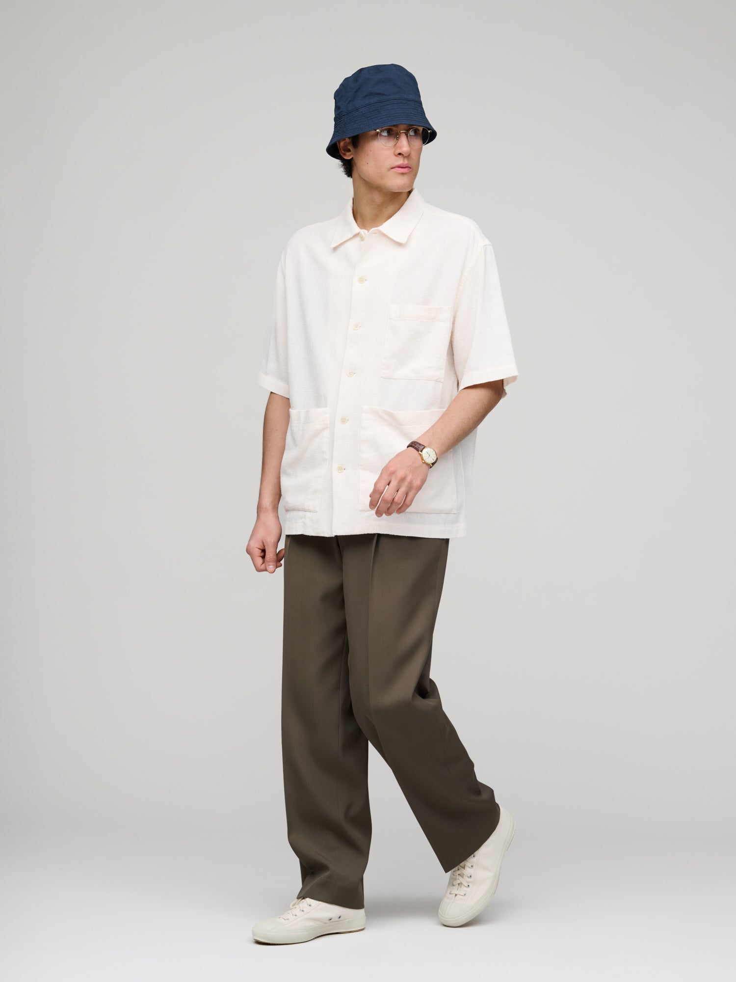 Drawing inspiration from the traditional utility of a barber's uniform, this shirt is defined by its clean, boxy silhouette and a trio of functional patch pockets. The design prioritises ease of movement, offering a generous fit that feels breezy and unrestrictive.