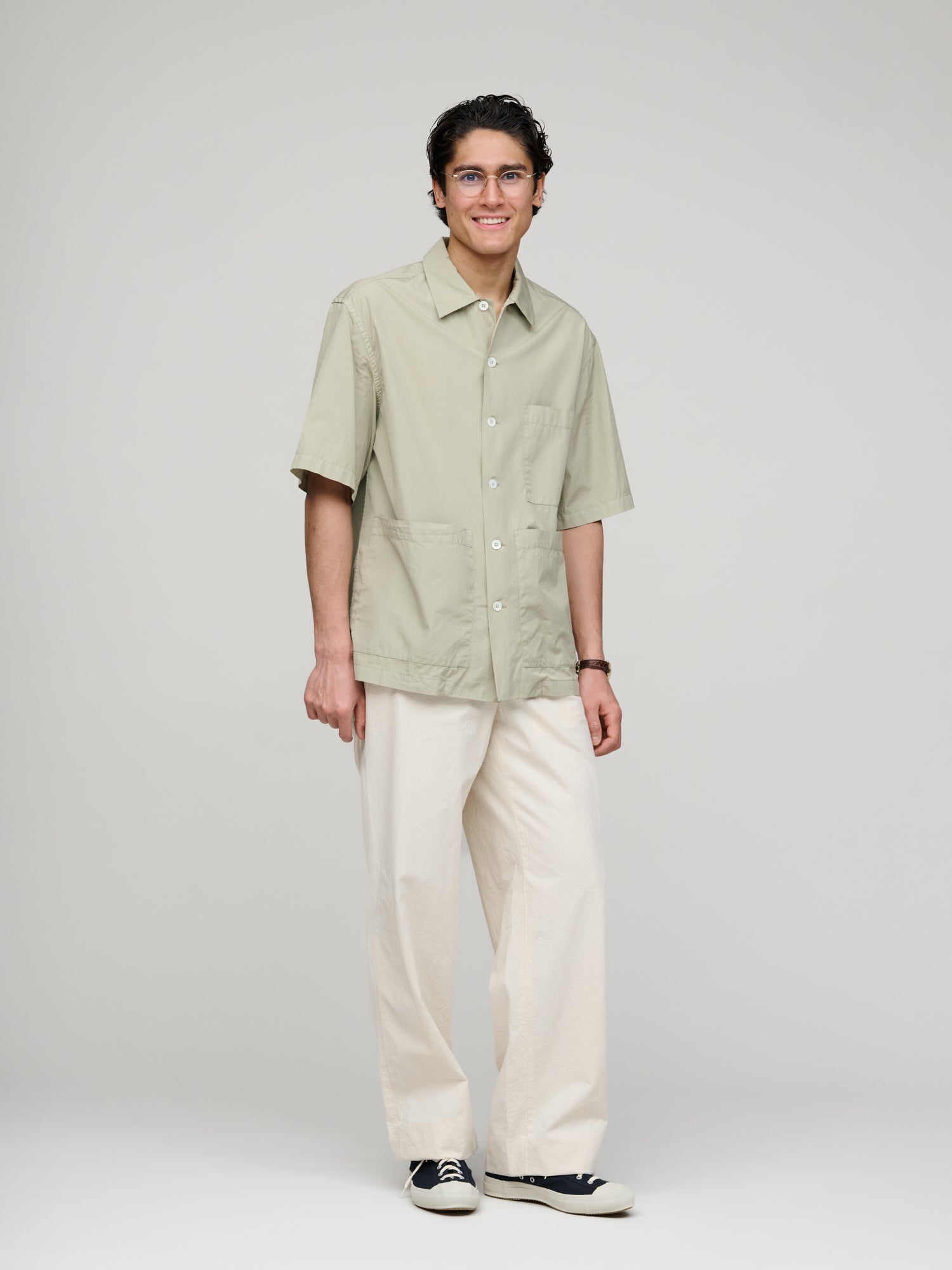 Drawing inspiration from the traditional utility of a barber's uniform, this shirt is defined by its clean, boxy silhouette and a trio of functional patch pockets. The design prioritises ease of movement, offering a generous fit that feels breezy and unrestrictive.