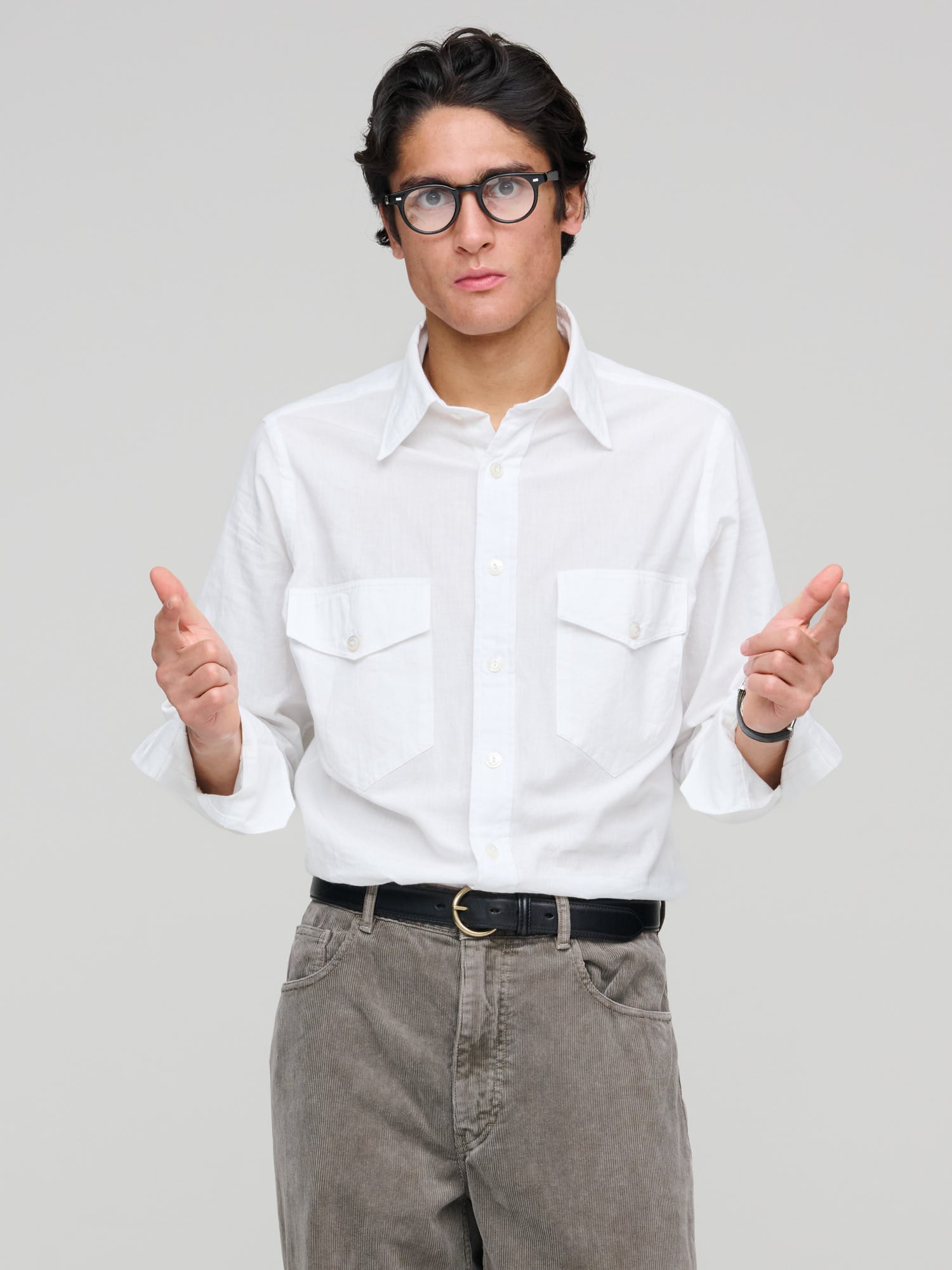 It features two buttoned chest pockets to keep your trousers light, twin-button cuffs, and a long point collar that gives it a slightly more tailored feel. Finished with single-needle stitching and corozo buttons – the same quality details you’d expect from Drake’s shirting.