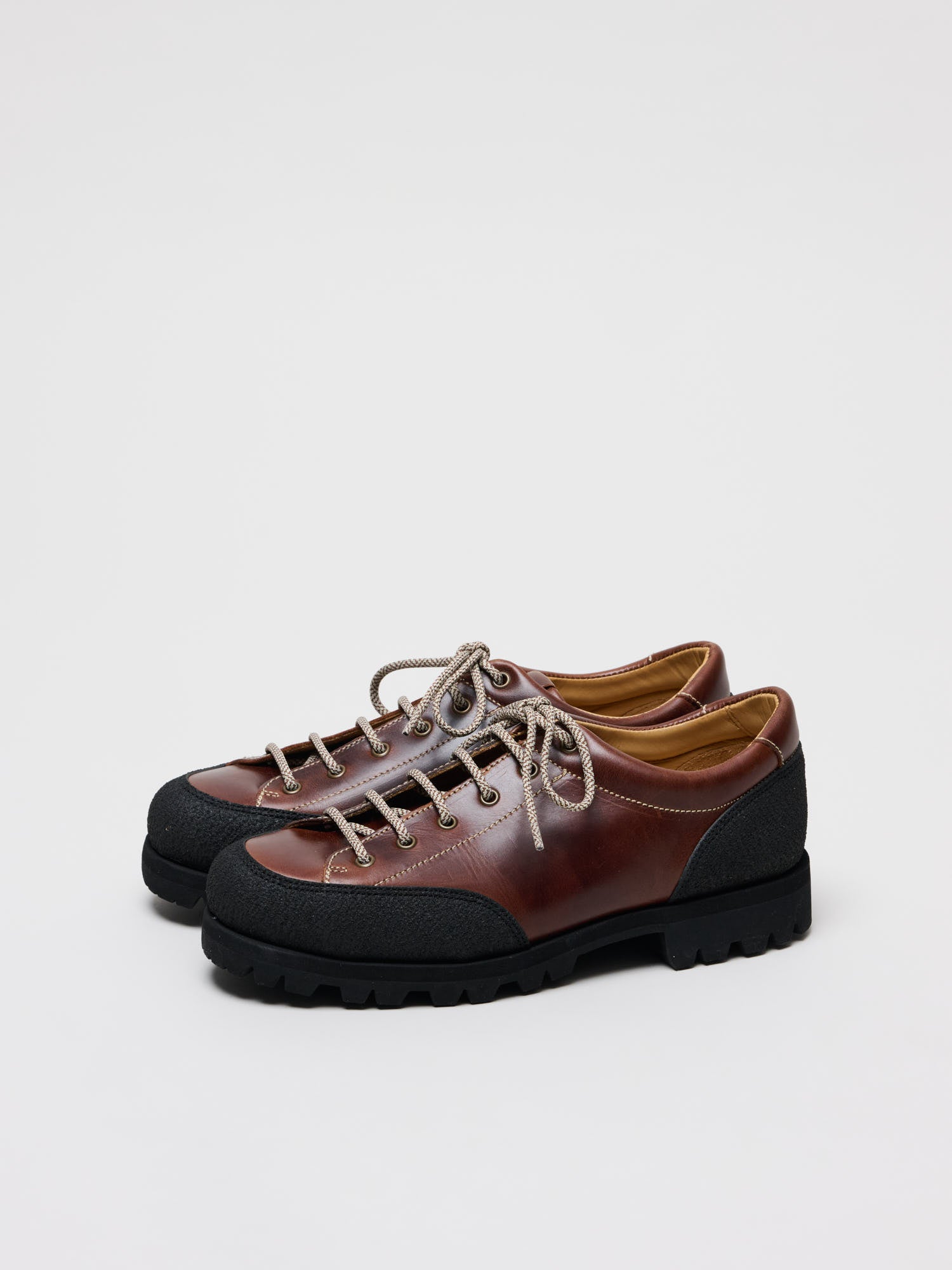 This model, inspired by the climbing shoes of the '70s, was designed with rubber coating strips on the front and back of the shoe to grip the rock face better on steep passages. Today, this model has come down from the mountain trails to the city. Today, this model has come down from the mountain trails to suit the city - Traditional last with slightly short, rounded toe. Blake stitching, leather lining - Natural gum sole
