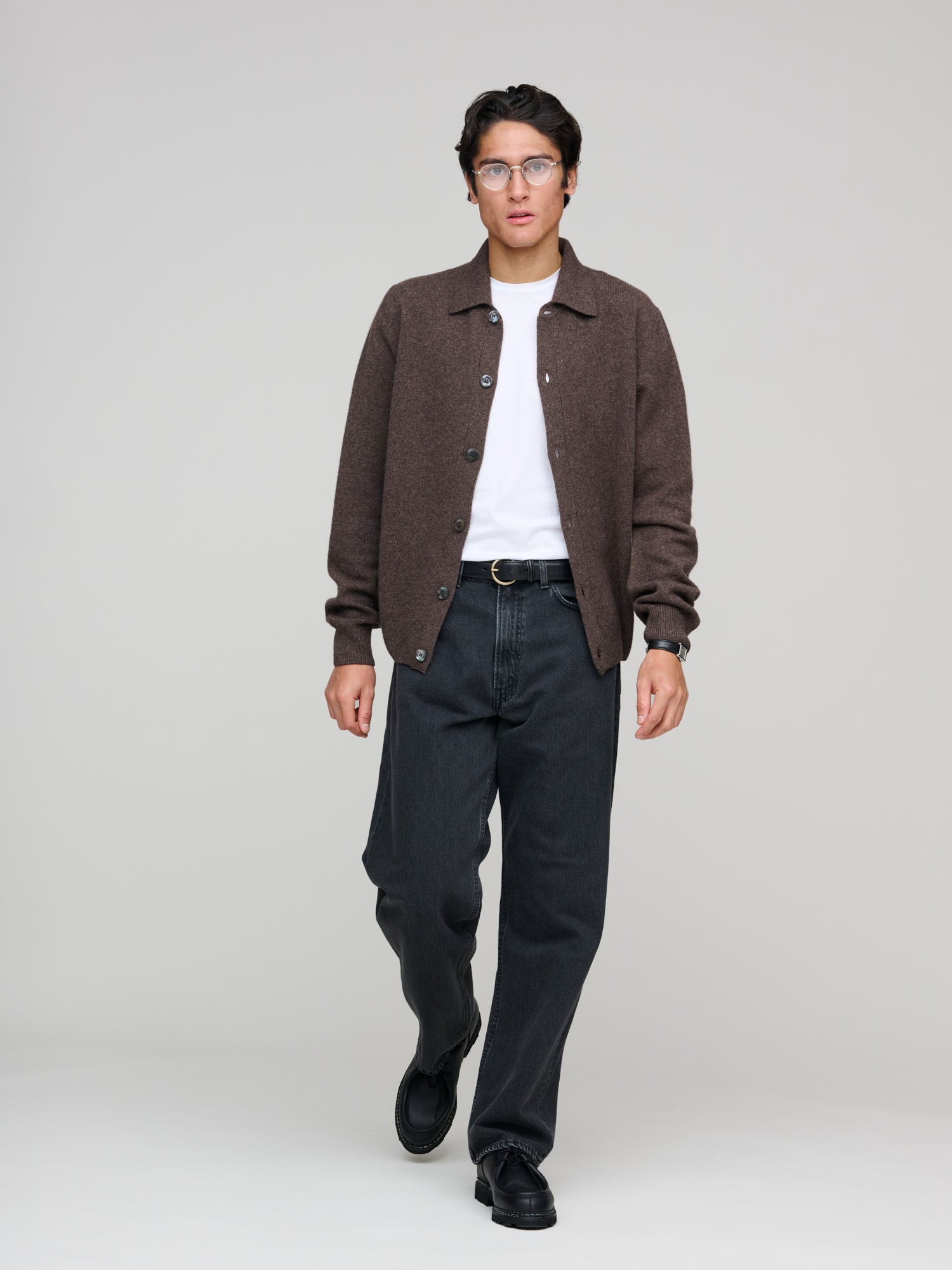 This is a new Fall–Winter 2025 development from our in-house knitwear line: a full-button cardigan with a polo collar, knitted in 100% merino wool from Zegna. It’s crafted with the same Italian knitting partner we’ve used in previous seasons. The piece has a soft hand feel and a versatile, understated character. Details include a polo neck and a six-button mother-of-pearl closure. We have high expectations for this style.
