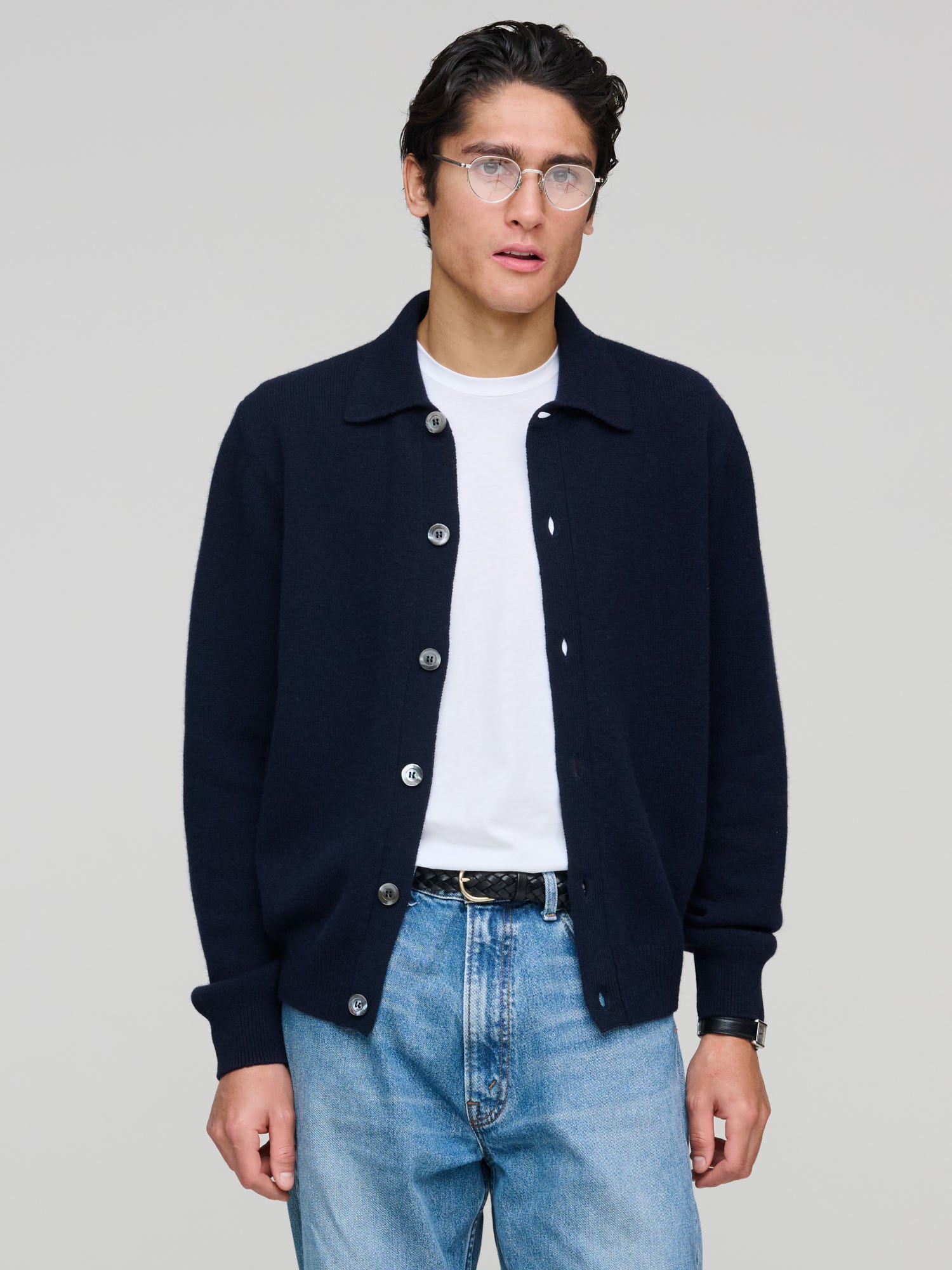 This is a new Fall–Winter 2025 development from our in-house knitwear line: a full-button cardigan with a polo collar, knitted in 100% merino wool from Zegna. It’s crafted with the same Italian knitting partner we’ve used in previous seasons. The piece has a soft hand feel and a versatile, understated character. Details include a polo neck and a six-button mother-of-pearl closure. We have high expectations for this style.