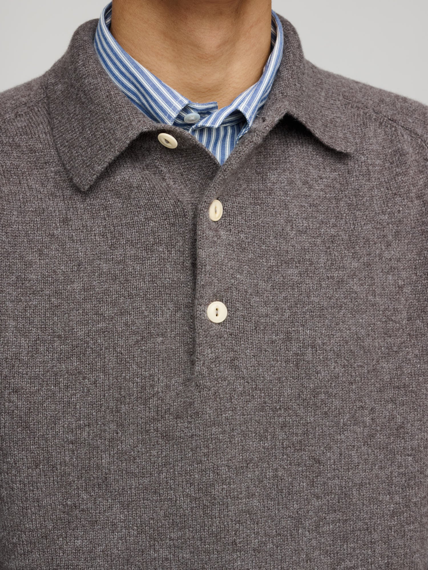 Our own super soft Pure Cashmere polo made by the same yarn producer as our cashmere/ extra fine lambswool blend crew neck and also the same knitter (both of whom are Italian). They have an overall aesthetic which is modern and personal, whilst staying within the framework of being a classic wardrobe staple.