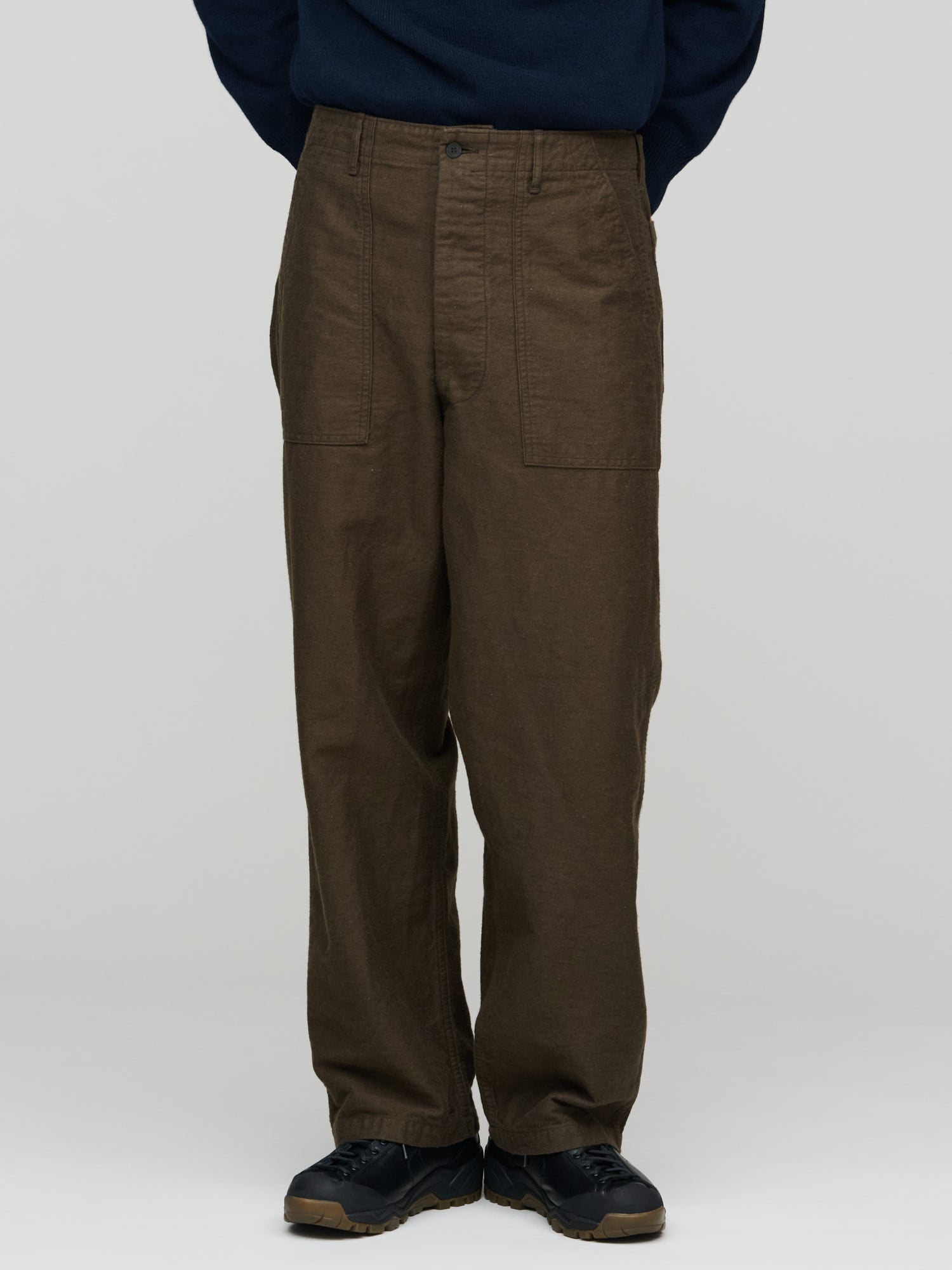 A relaxed fit pant from orSlow, tailored in Japan with a durable cotton-linen moleskin fabric that’s been softly brushed for a lived-in texture. The straight, relaxed leg features fatigue-style patch pockets, an adjustable waist tab for fit refinement, and large back pockets. They deliver heritage utility with refined details.