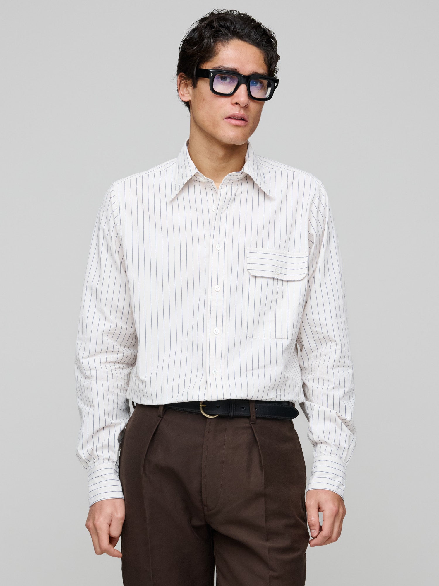 Cut in our relaxed block, this shirt offers an effortless, easygoing fit. The fine green pencil stripe adds quiet character with a touch of vintage attitude, while the elongated point collar nods subtly to mid-century classics.