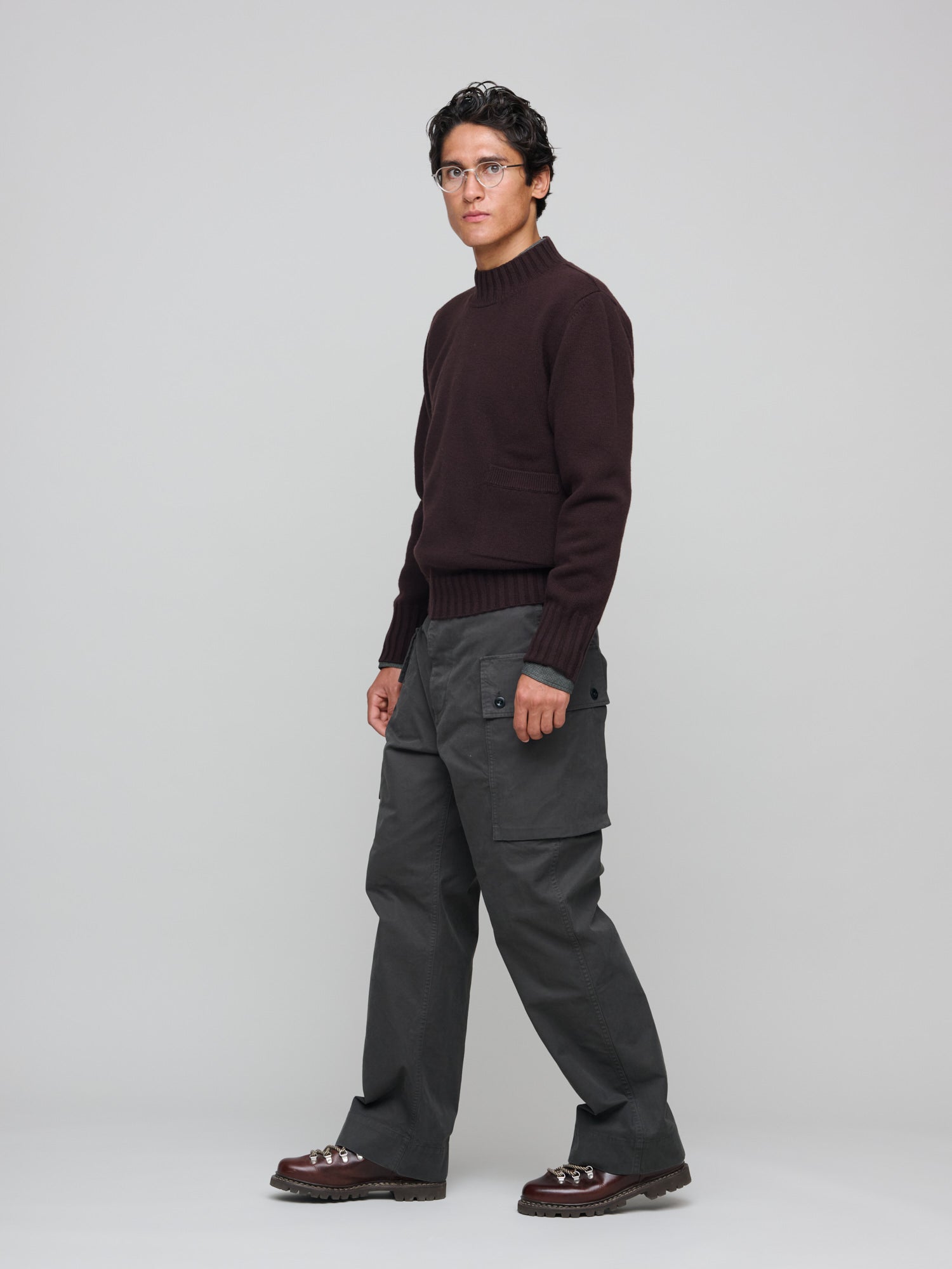 Relaxed fit with a deep crew neck and fully fashioned construction. Features a small integral pocket on the left front side, with ribbed neck, cuffs, and hem. Knitted in midweight Geelong lambswool with a lofted, soft finish.
