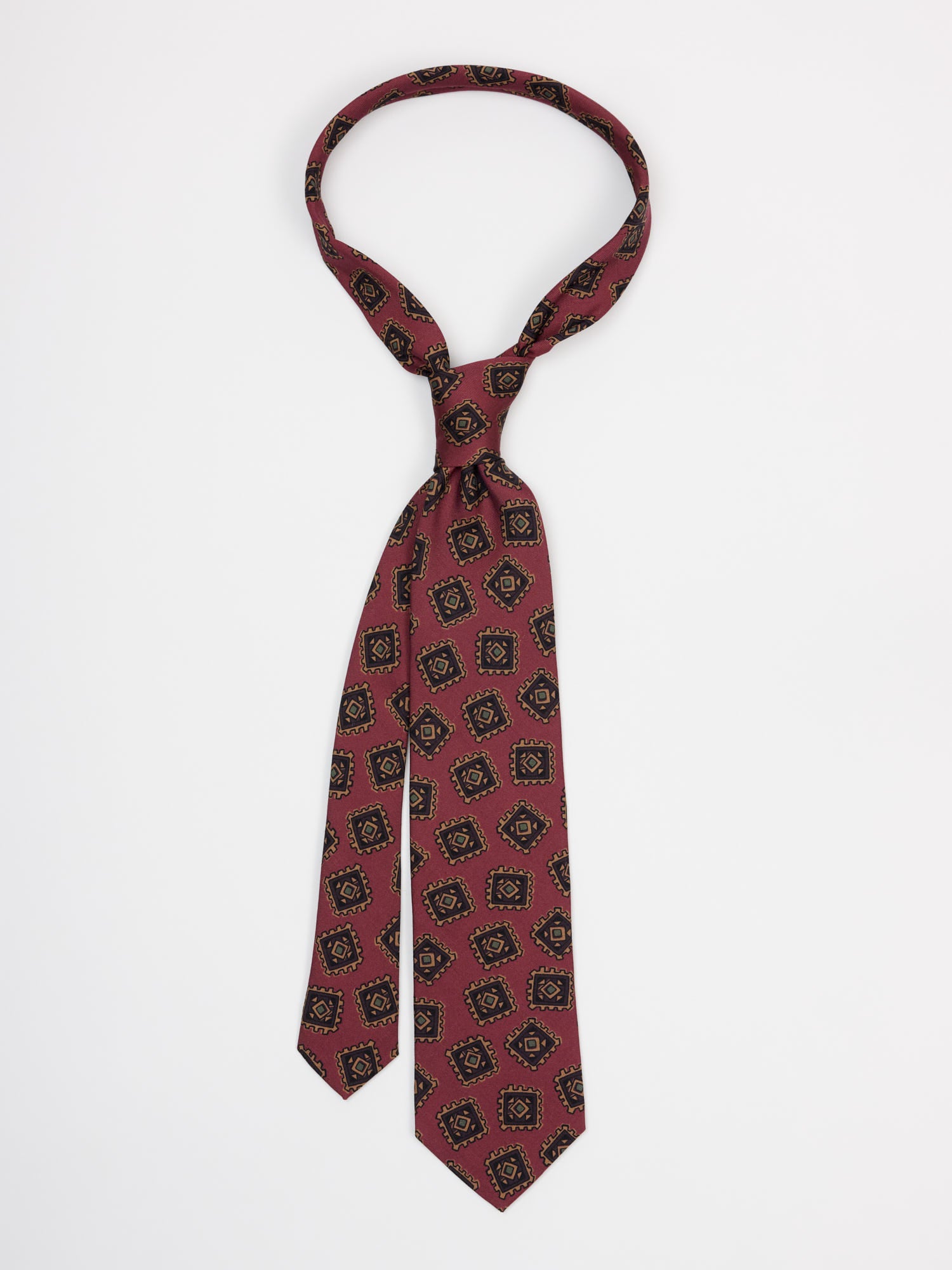 This one features an ornate repeating motif—elegant and timeless, printed on a wool-silk blend and hand-rolled by skilled tie makers in East London.