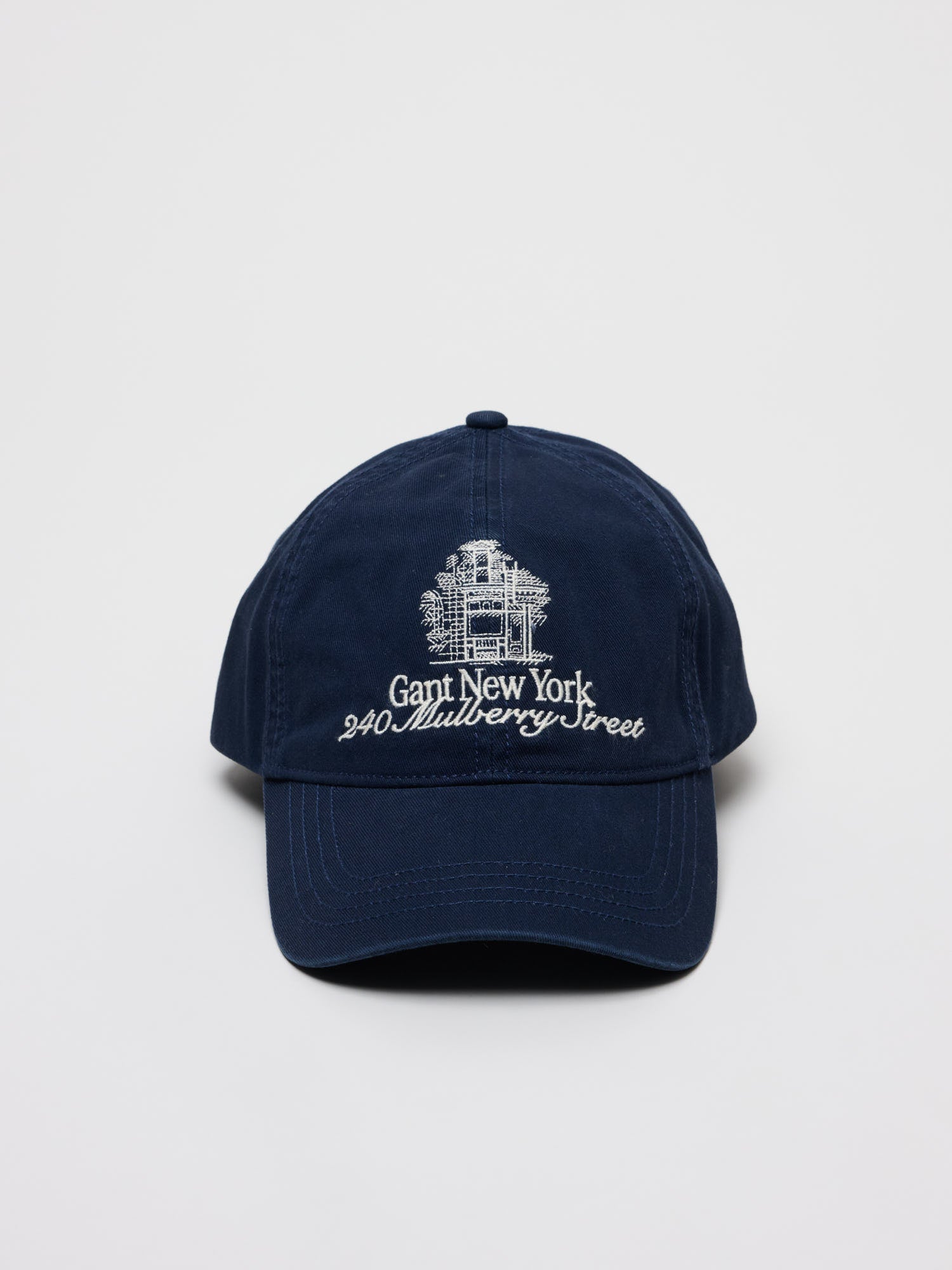 Part of GANT’s premium 240 Mulberry Street collection. This cap is crafted from washed twill in 100% organic cotton with a classic 6-panel construction. Featuring an embroidered illustration at the front and GANT lettering at the back arch. Finished with an adjustable strap and engraved buckle.